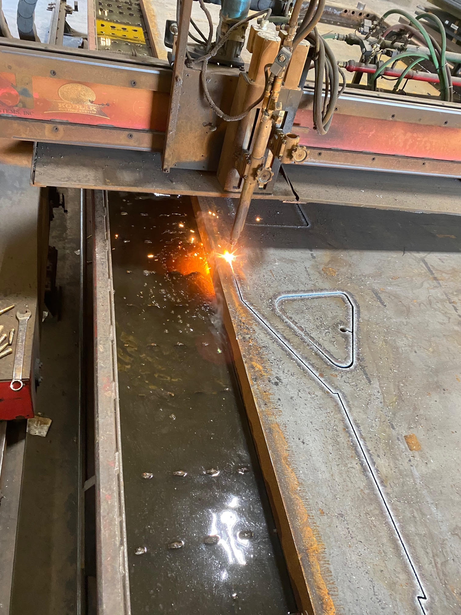 In May, a purchase order was sent to Precision Grinding, Inc. of Birmingham, Alabama. This firm has produced the main frame sections and several smaller items such as brake levers and suspension elements that require plasma cutting and precise grinding. Most of our order has been completed and will be shipped to Sheepscot shortly. Here we see a portion of the frame being plasma cut.