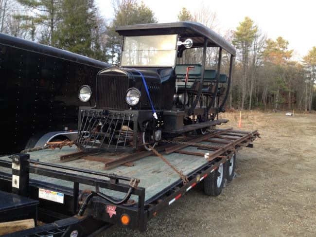 WW&F Model T railcar No. 4 loaded for transport to Albion Day in November 2013.  Stewart Rhine photo.